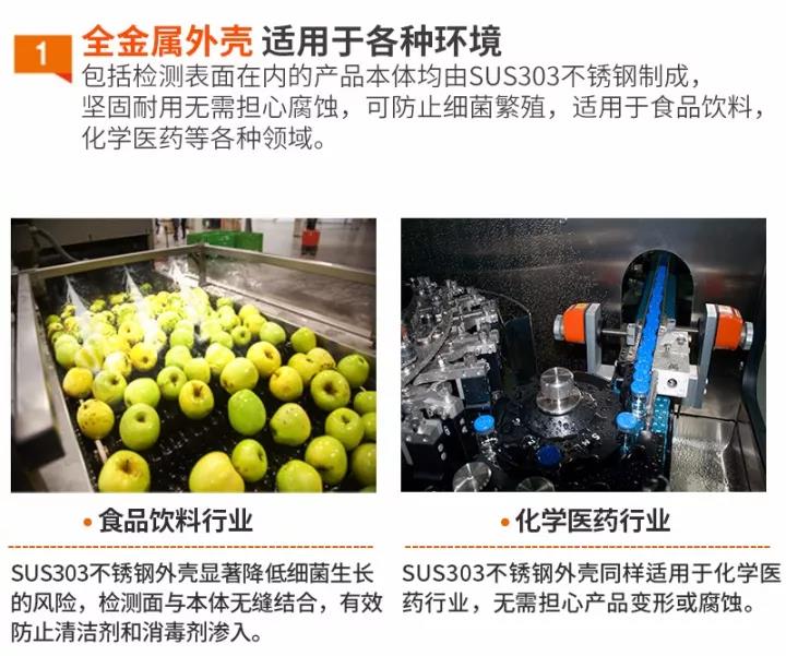 PRF系列圆柱形配线引出型接近开关采用不锈钢303制成的全金属外壳及传感器头部,坚固耐用,具有很强的耐磨损和耐腐蚀能力,可用于各种环境,包括食品和饮料制造,化学和金属加工等行业。 0.8mm厚度的金属开关头部提供了较高的耐冲击和耐磨损性能,360°环型动作指示灯可以让用户从各个角度快速识别动作状态。