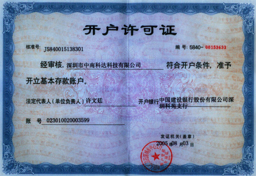 中南科达科技有限公司银行开户许可证