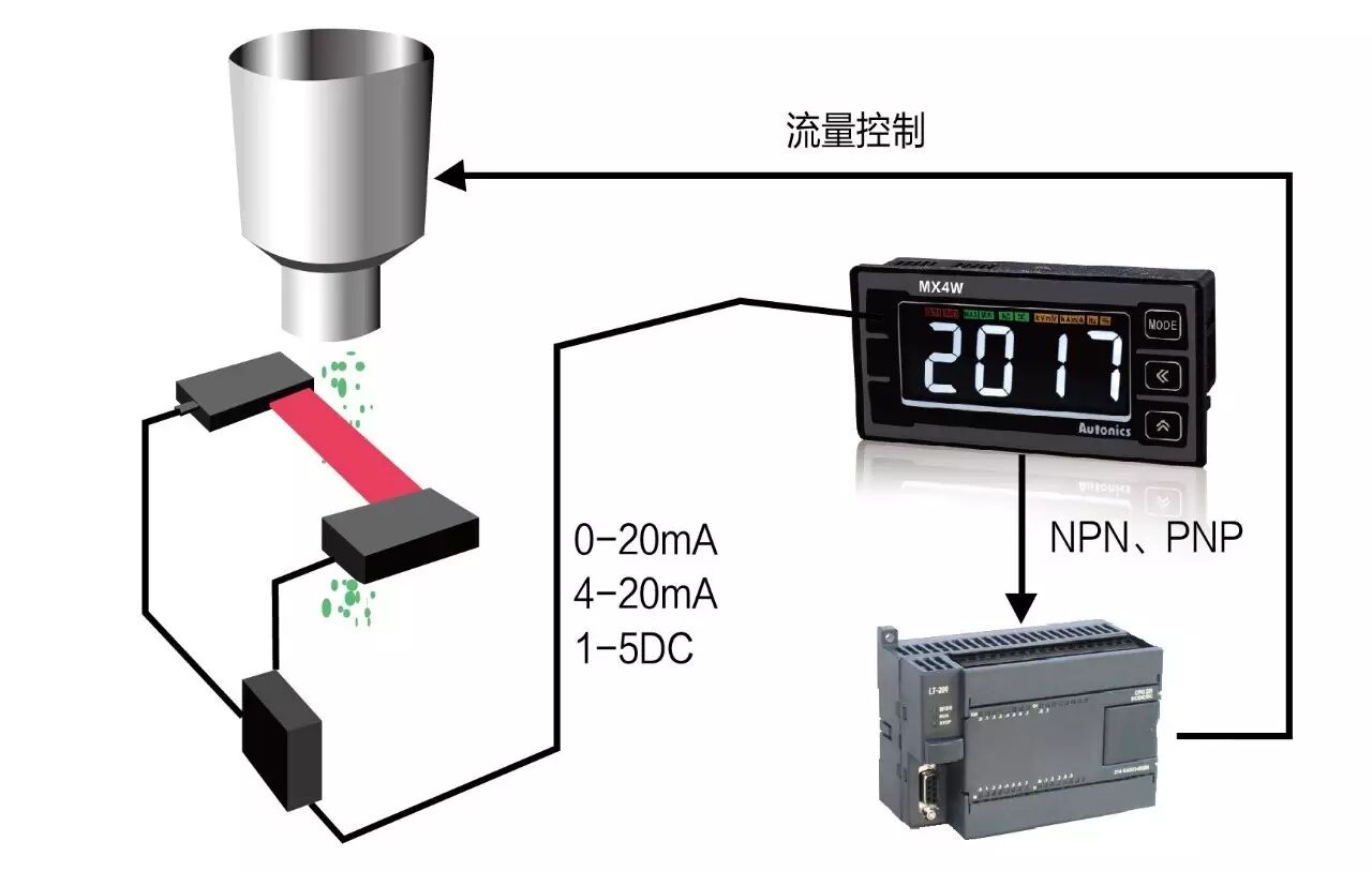 通过模拟光电传感器检测粉末的释放量,再用数字面板表对4~20mA的线性输出进行测量及显示。并通过NPN.PNP输出将数据传送给PLC,对释放量进行监测。