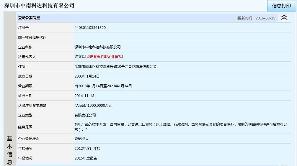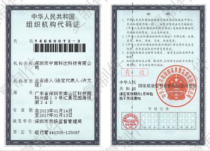 深圳市中南科达科技有限公司组织机构代码证